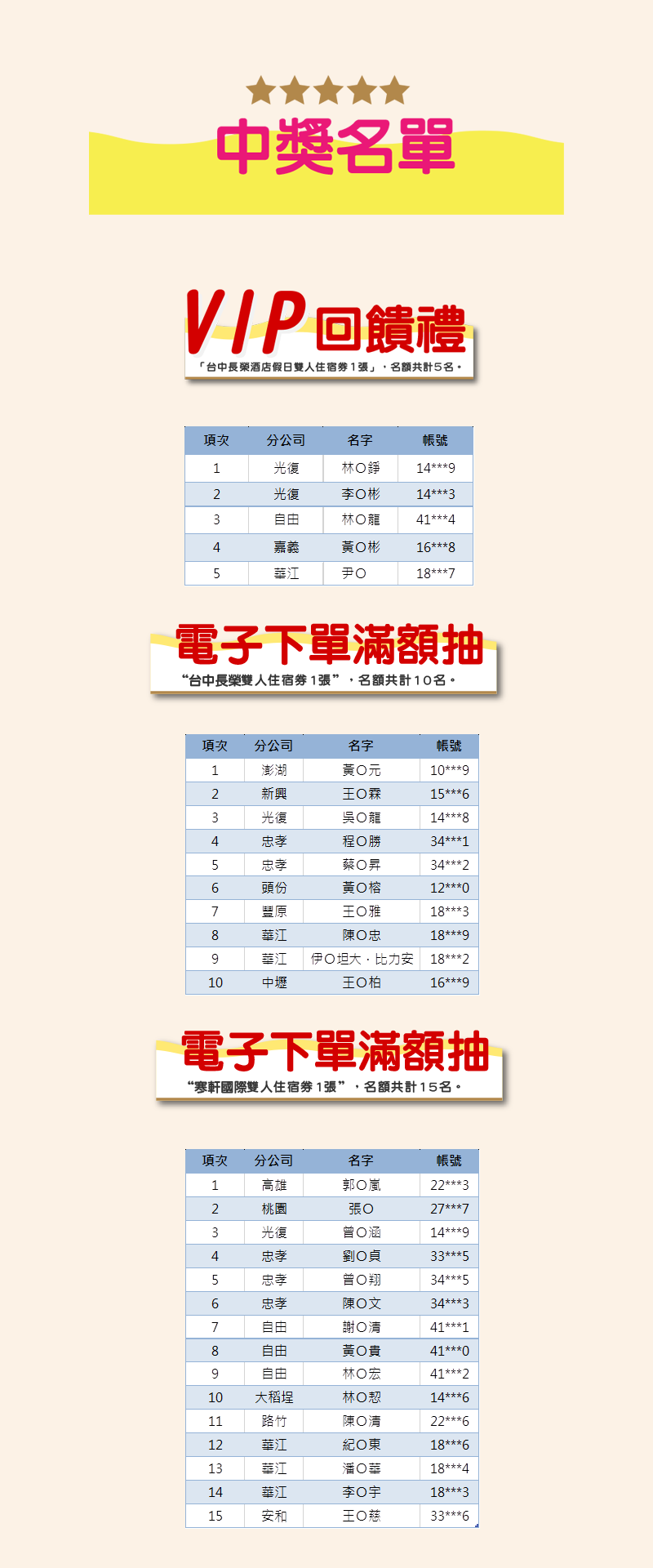 3.交易滿額抽與VIP回饋禮限獲一次獎項,不可重覆獲獎;「電子交易首動送」可與「交易滿額抽」或「VIP回饋禮」重覆獲獎 。