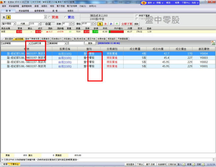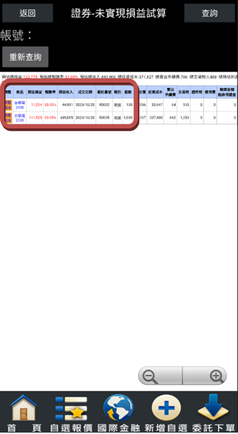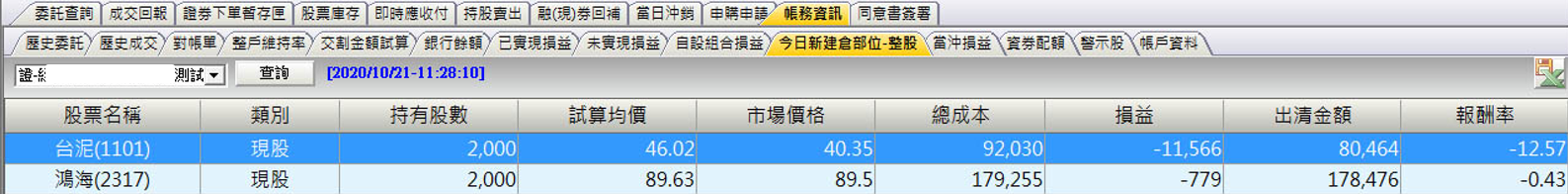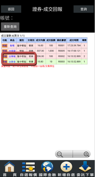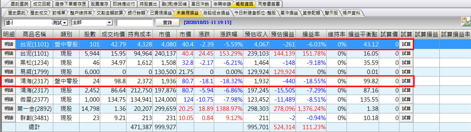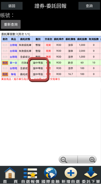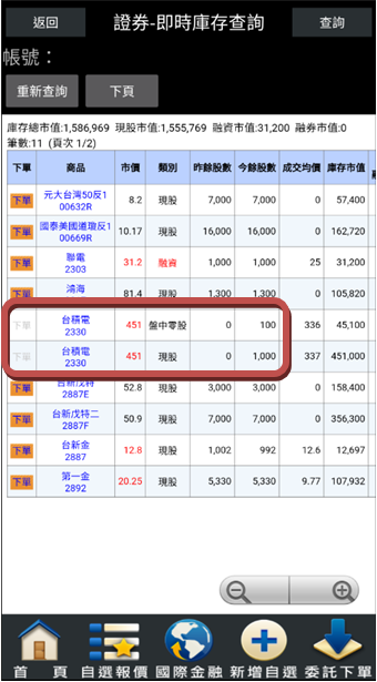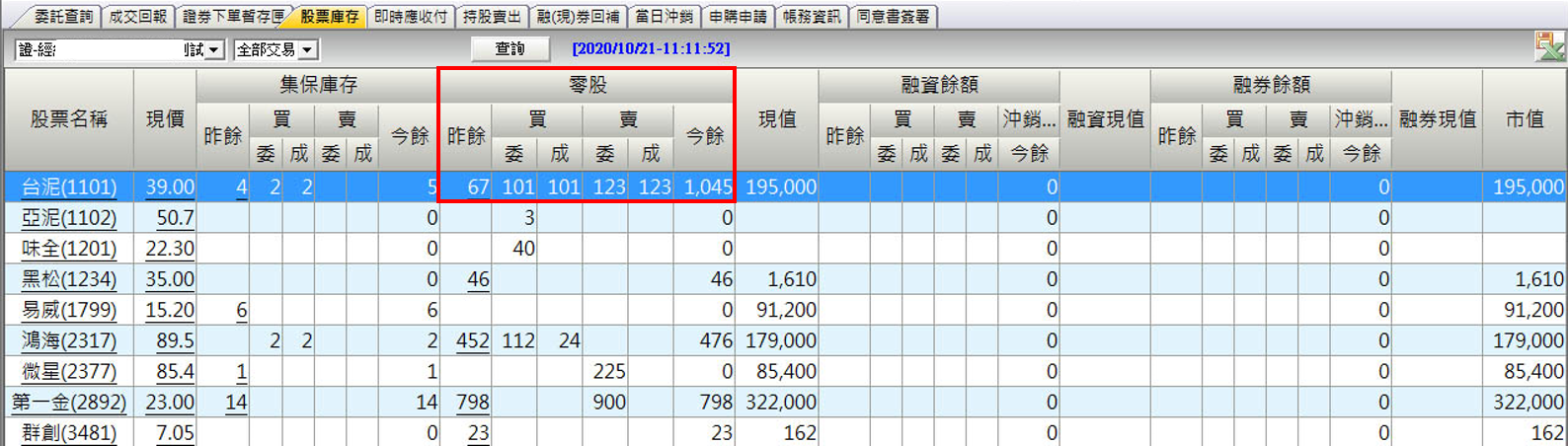 當天盤中零股買進的零股在「未實現損益」會新增盤中零股明細,待當天收盤於系統轉檔後會彙整至整股