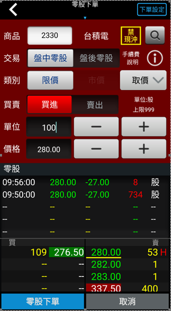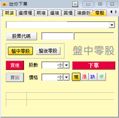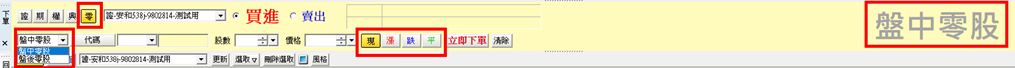 下單列新增【零】按鈕,盤別只提供:盤中零股、盤後零股,並清楚顯示盤中零股、盤後零股字樣