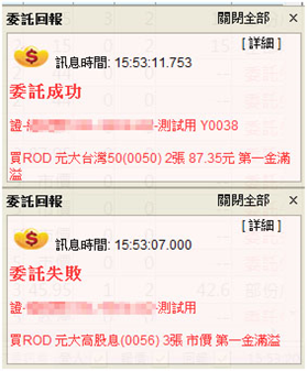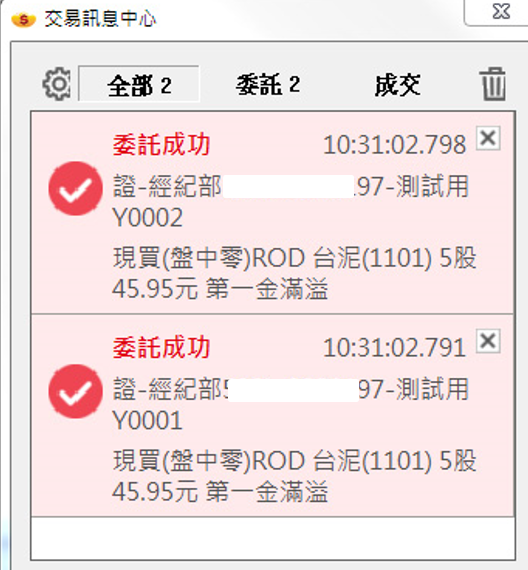 交易訊息中心顯示(彙整成全部/委託/成交,僅顯示在單一視窗顯示)