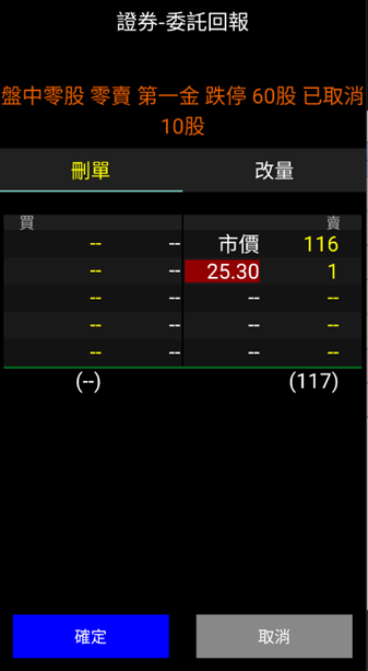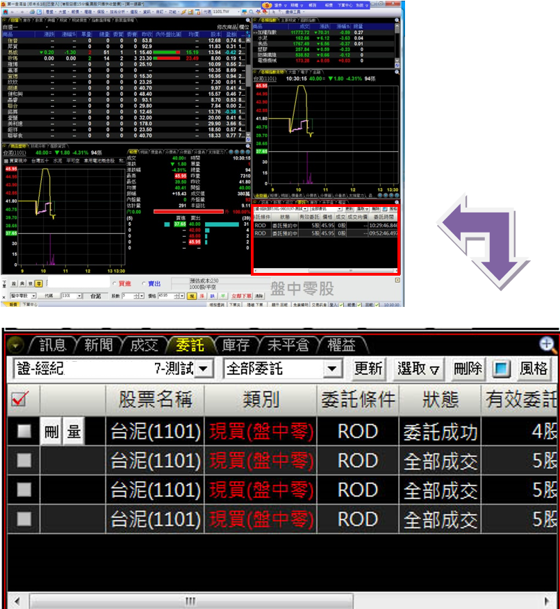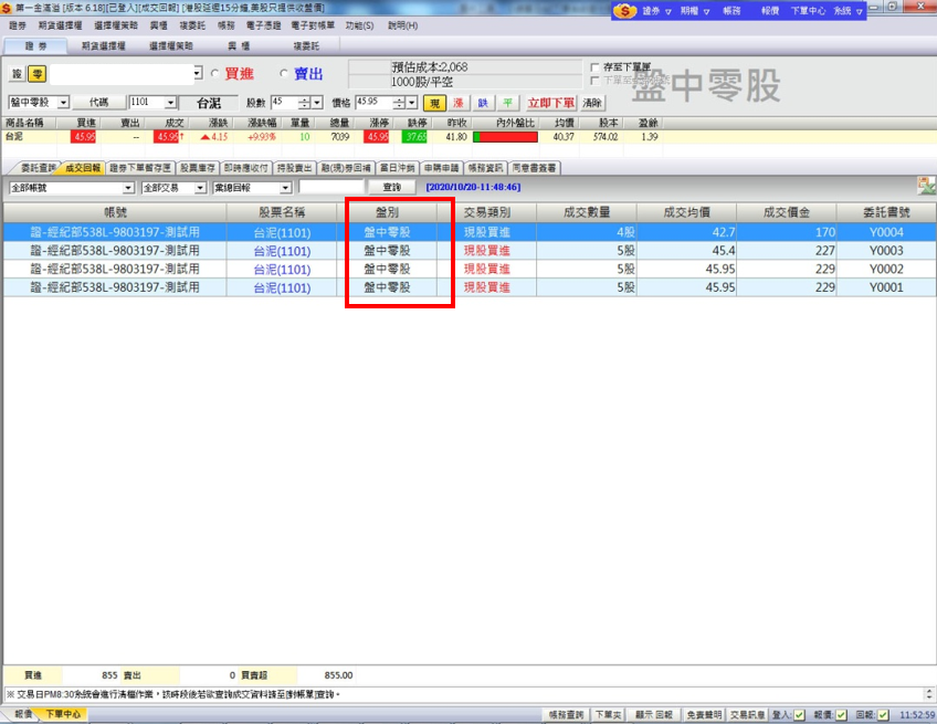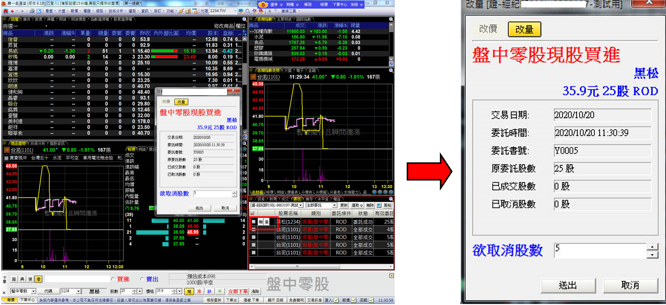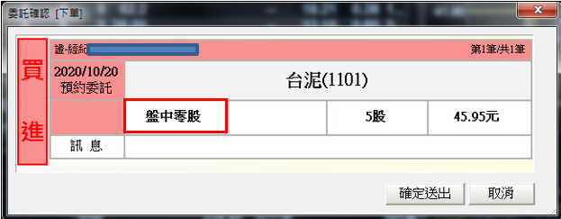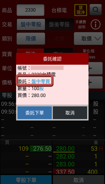4.「下單確認視窗」及「委託成交主動回報」委託類別明確顯示【盤中零股】