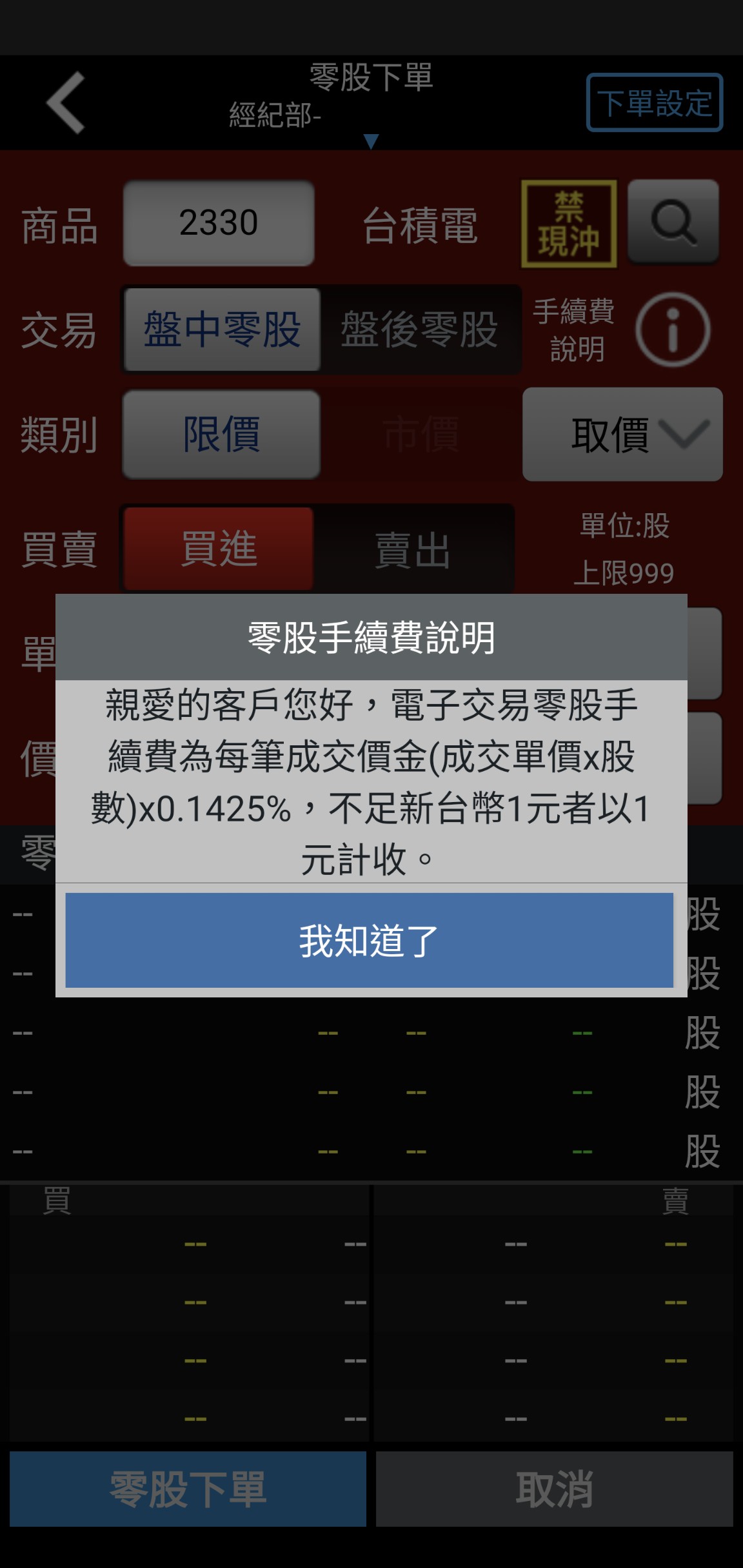 登入到盤中零股下單畫面會彈跳出零股交易手續費說明