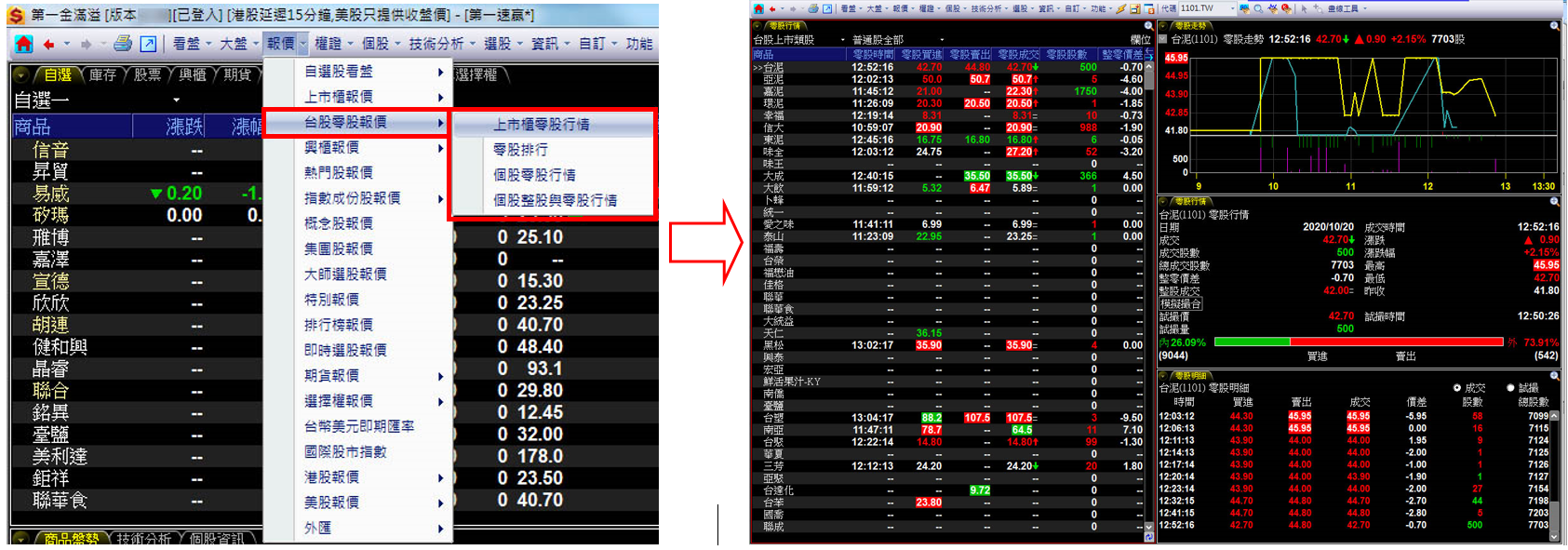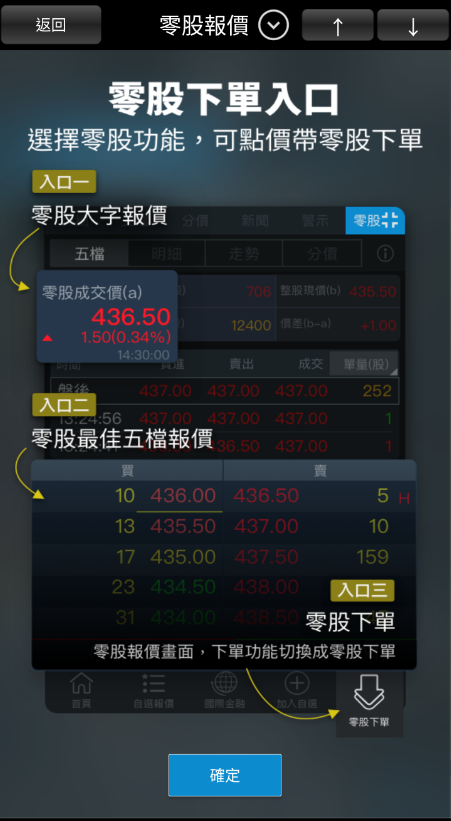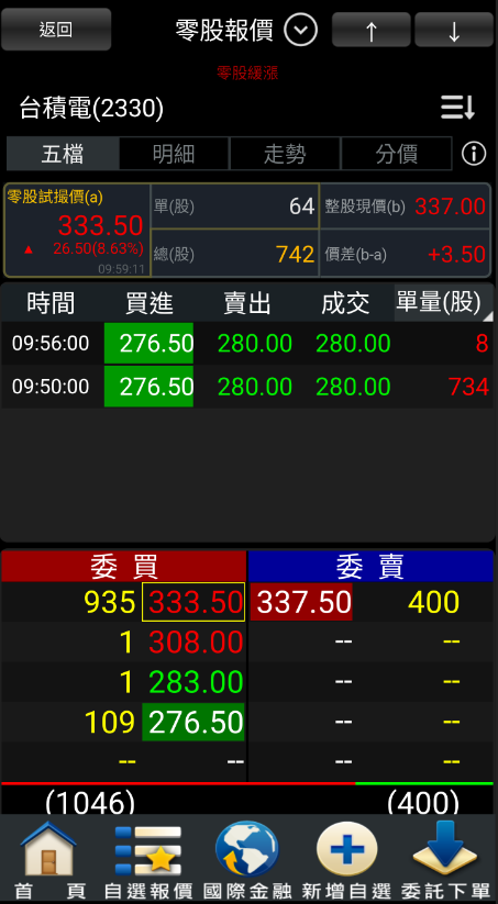 3.零股報價: 可查看「五檔」、「明細」、「走勢」、「分價」等畫面