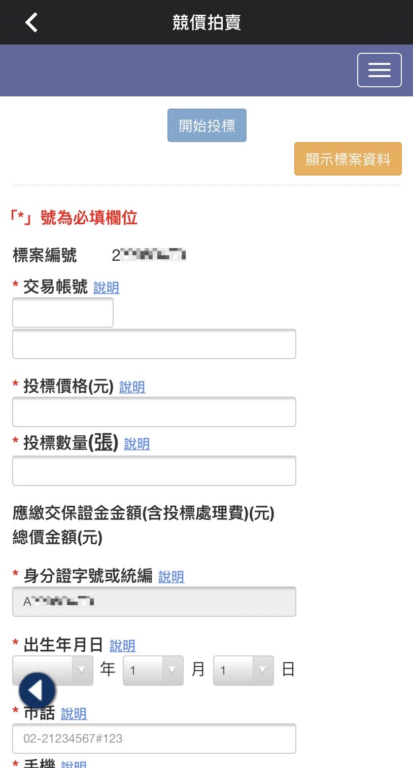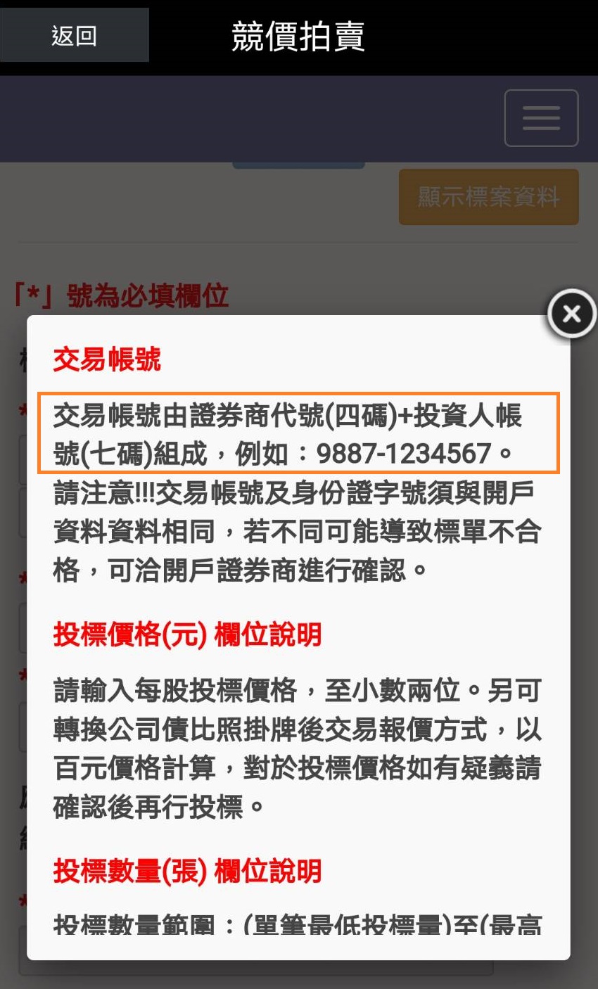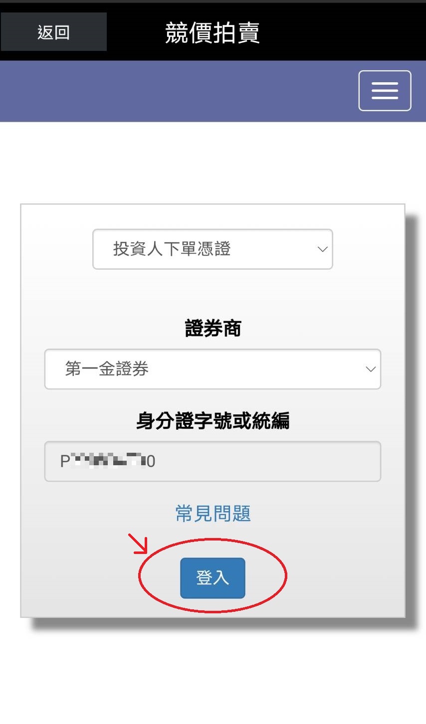 競拍流程需要輸入證券商代號(4碼)+投資人帳號(7碼)組成之交易帳號,如果不知道自己的帳號,可先至第一金滿溢查看自己的交易帳號,也可以至第一金證券官網查看證券商代號